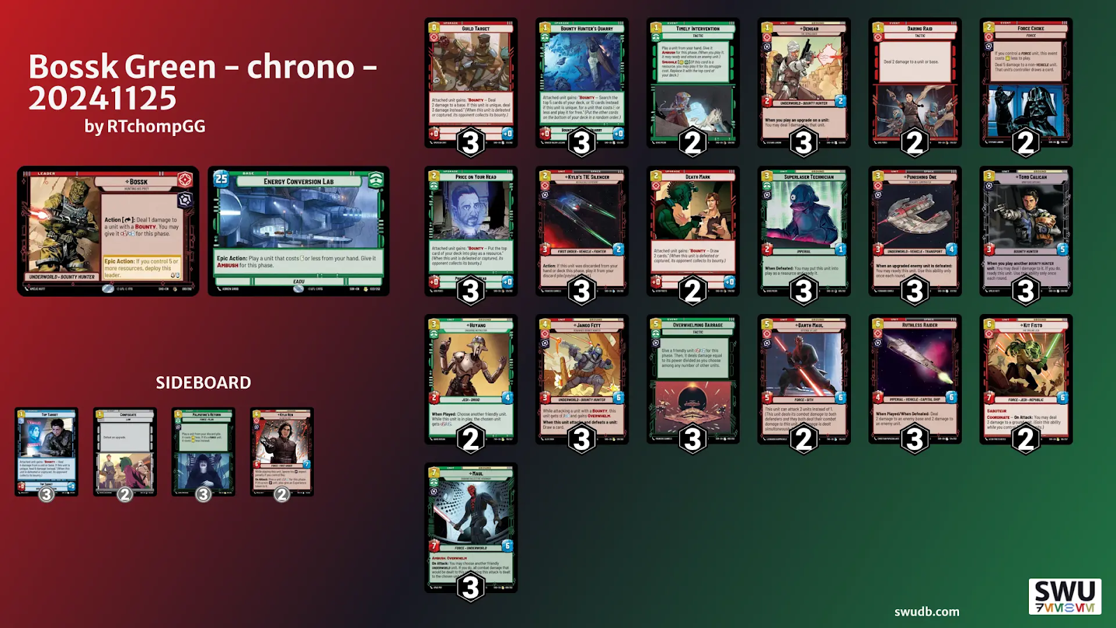 This write-up is intended to help me decide about playing Bossk/ECL at the upcoming Planetary Qualifiers. To accomplish that I am trying to consolidate my thoughts on matchups, boarding strategies, as well as the other factors. This deck is utilizing Chrono’s build for Bossk/ECL.
